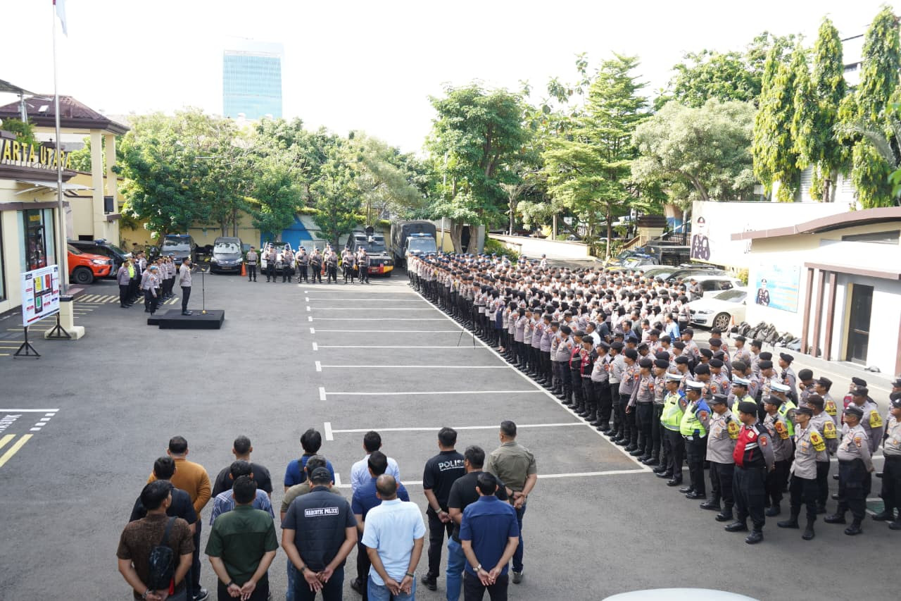 Jakarta Utara, Polres Metro Jakarta Utara menggelar apel kesiapan pengamanan menjelang aksi unjuk rasa yang akan dilakukan Paguyuban Masyarakat Sunter Jaya di Kantor Badan Pertanahan Nasional (BPN) Kota Jakarta Utara, Rabu (26/11/2025).